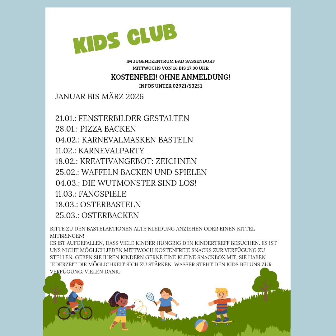 Jeden Mittwoch findet von 16 bis 17.30 Uhr der Kids Club für Kinder im Alter zwischen 6 und 10 Jahren statt.