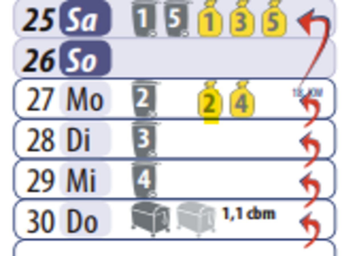 Anders als im gedruckten Abfallkalender angegeben erfolgt aufgrund des Feiertages „Tag der Arbeit“ am 1. Mai 2026 die Leerung der Restabfallbehälter in den Abfuhrbezirken 2 - 4 in der 18. Kalenderwoche jeweils einen Tag früher als gewohnt. Die Leerung der Restabfallbehälter in den Abfuhrbezirken 1 + 5 erfolgt bereits schon am Samstag, 25.04.2026!