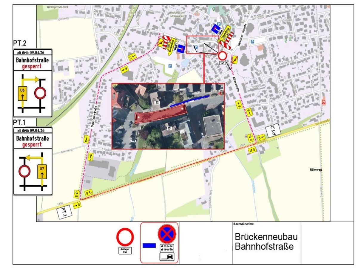 Am Donnerstag, 9. April, beginnen die Arbeiten für den Neubau der Brücke über die Rosenau an der Bahnhofstraße (K 5) in Bad Sassendorf. Es wird mit einer Bauzeit von etwa zwei Monaten gerechnet. Da die Bahnhofstraße zu eng ist, um den Verkehr einseitig an der Baustelle vorbeizuführen, wird die Straße während der Bauphase voll gesperrt. Eine Umleitung wird ausgeschildert.